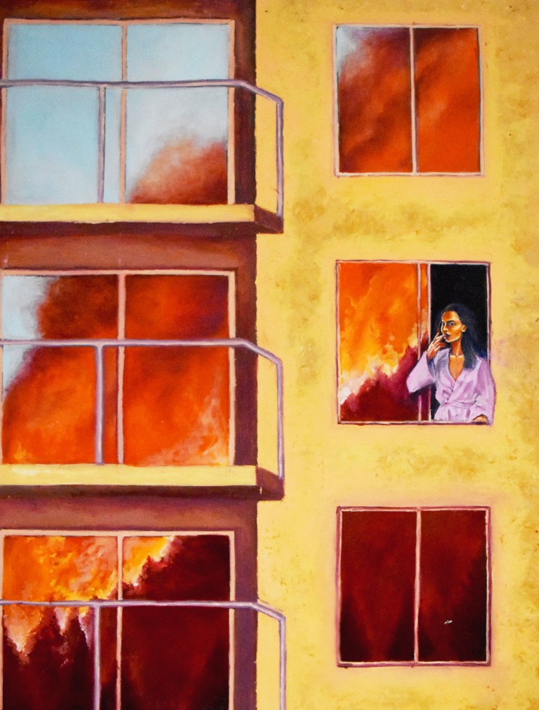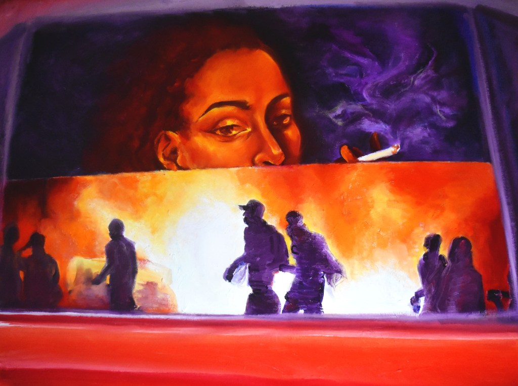 Dumpster Fire, 2020, 36×36”, oil on canvasLandfill, 2021, 24×38”, oil on canvasBackseat Driver, 2023, 36×48”, oil painting on canvas State of the Union, 2025, 36×48”, oil painting on canvasThe Thinker, 2019, 36×36”, oil on canvasBlock Party, 2020, 24×36”, oil on canvasAt The End Of The End, 2024, 36×48”, oil painting on canvasFit Check, 2023, 36×24”, oil on canvasTo Ashes, 2022, 36×36”, oil on canvasA Perfect Manhattan, 2021, 36×36, oil painting on canvasShock Wave, 2022, 36×36”, oil on canvasFor The Best, 2024, 30×48”, oil painting on canvasOff the Wall, 2025, 36×24”, oil on canvas