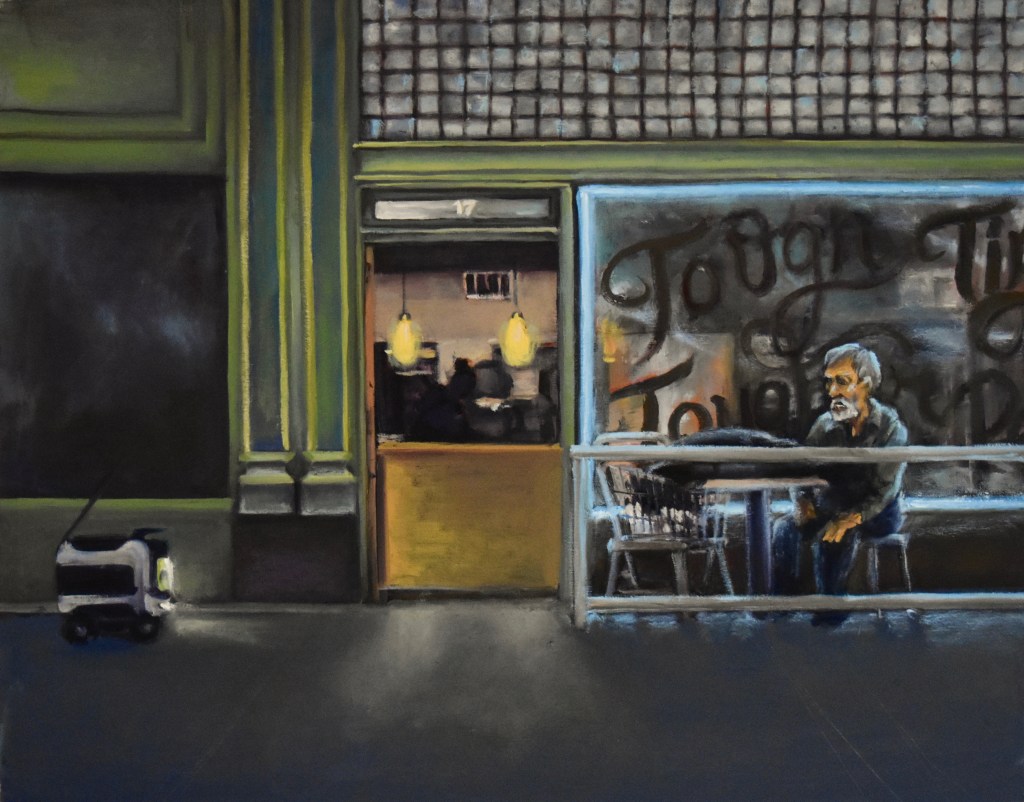Woman Stepping Over A Cigarette Packet, 2021, 24×36”, oil on canvasNo Place Like Home, 2023, 16×20”, oil on canvasS 2nd St., 2023, 16×20”, oil on canvasRonnie In The Park, 2021, oil on canvas, 12×18″Sweep, 2022, 16×20”, oil on canvasTenant, 2022, 16×20”, oil on canvasSecond St., 2021, oil on canvas, 12×18″